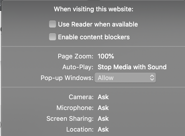 Click inside the box next to "Pop-up Windows" and choose "Allow".
