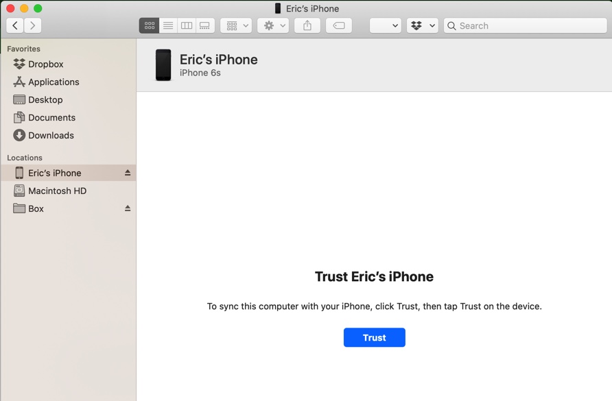 I'm trying to restore an iPhone 6s that I haven't used in quite a while (hoping to gift it to my son). When I try to access the device, I get an error message, "iPhone is disabled connect to iTunes" (probably due to repeated unsuccessful attempts). So I went through all the steps listed on the apple care website re: restoring and/or updating the device. The problem is that - now that I have Catalina installed - I no longer have iTunes. And when I get to the very end of the steps, the computer asks, "Trust Eric's iPhone" (bold text); "To sync this computer with your iPhone, click Trust, then tap Trust on the device." Below this text there's the blue "Trust" button. However, I am unable to "tap Trust on the device" because the device is disabled.
