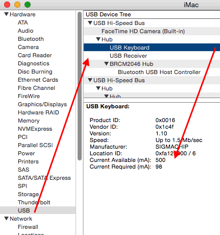 In About this Mac>System Report>Hardware>USB, what is listed & mA used?