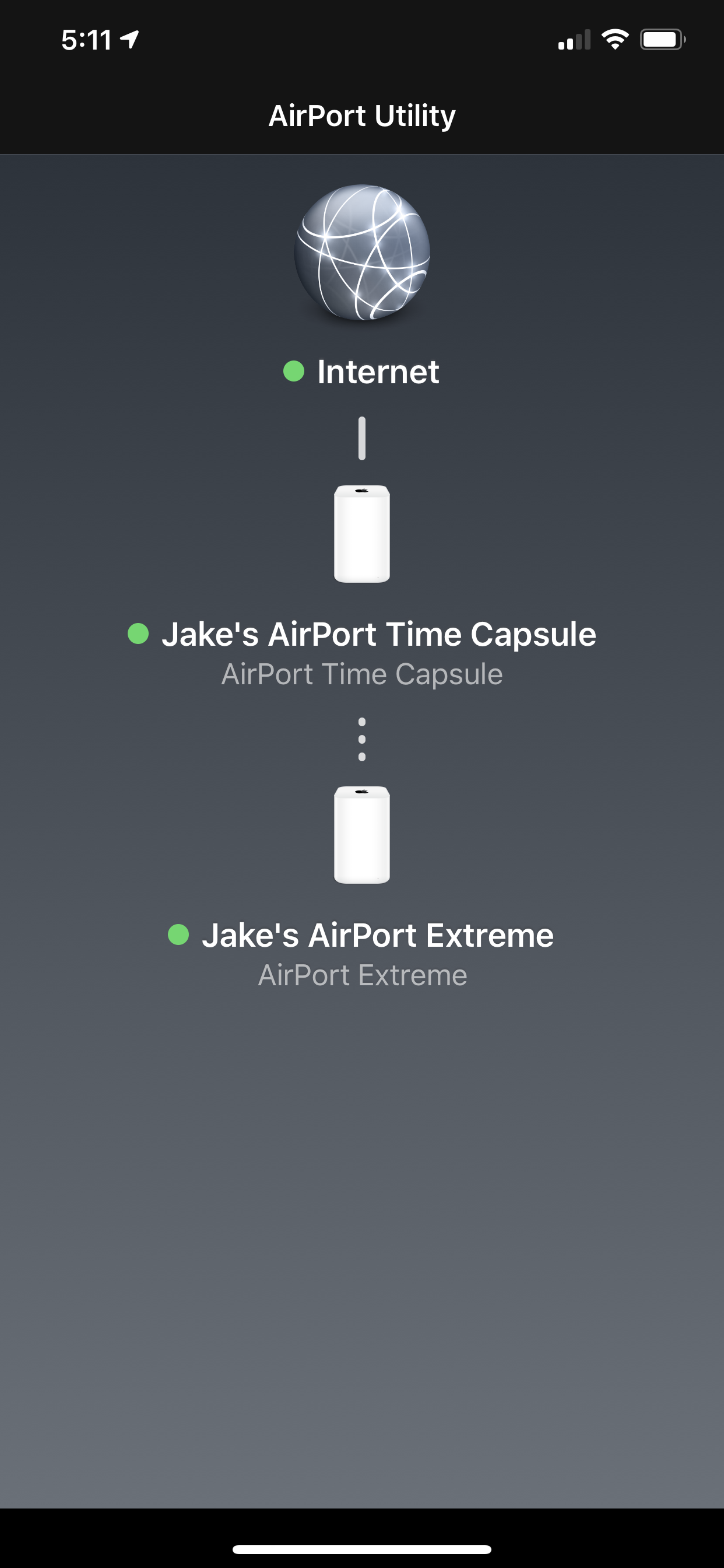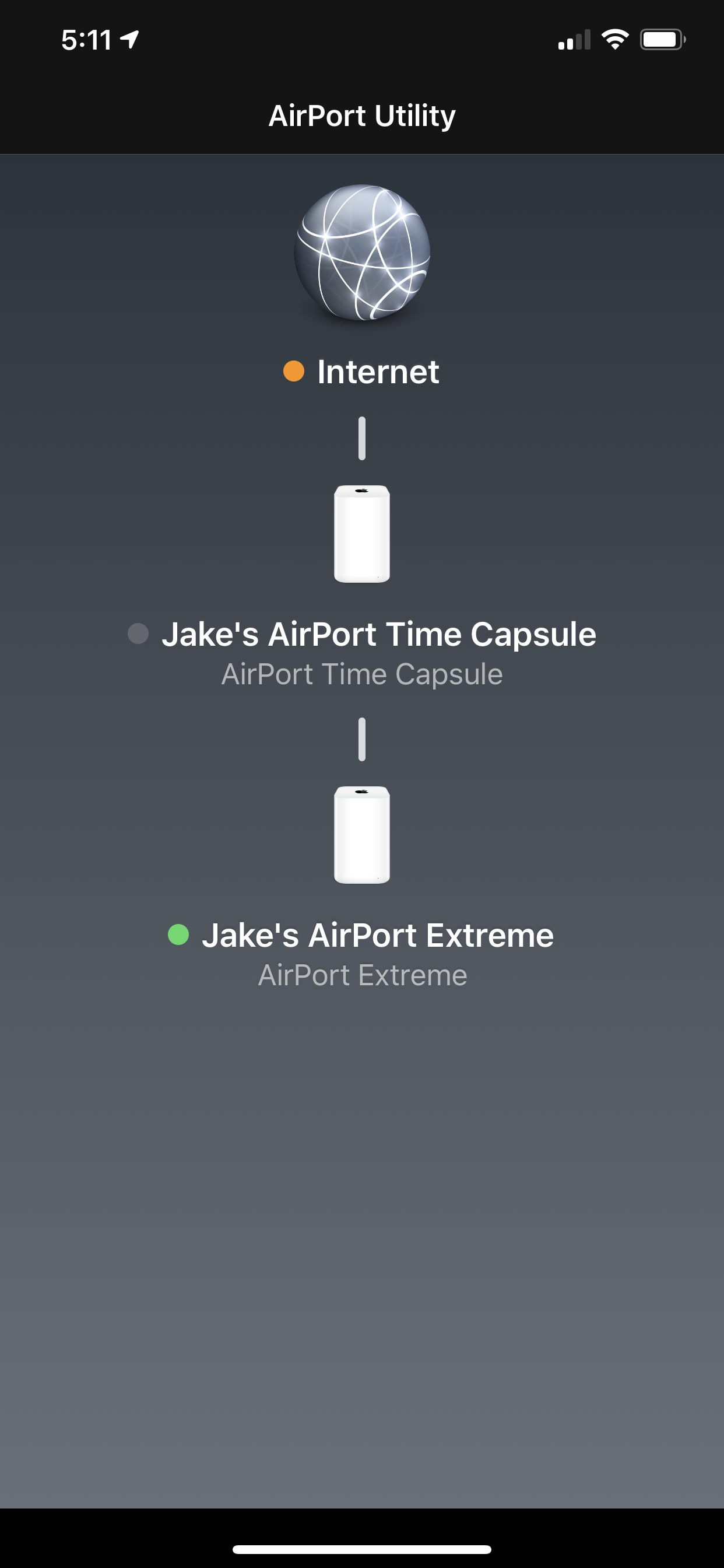 The only thing out of the ordinary is when I am having issues and bring up airport utility, the light next to “internet” is orange. A few seconds later it switches to green. (The time capsule and extreme show a steady green light the whole time).