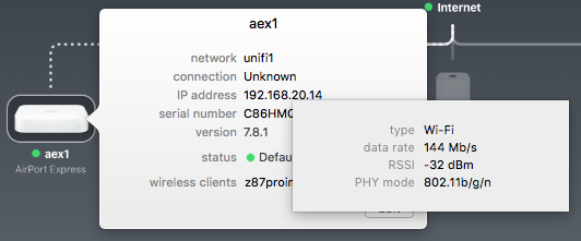 This is important. Everything connected to the AE which might be connected by ethernet or wireless AC at very high speed.. is then forced down this small pipe. As you can see my Express has joined the Extreme at a speed of 144Mb/s using 2.4ghz N wireless. It has excellent signal and speed but using N wireless it is slow. Hopefully your Extreme is doing a lot better than that. Real world throughput over 144Mb/s will be no more than 70Mb/s and if you are using a wireless client on the Extreme it will halve again down to 35Mb/s (that is bits per sec.. which is how network speeds are measured.. file transfers are measured in Bytes per sec.. 8 bits to a Byte.)