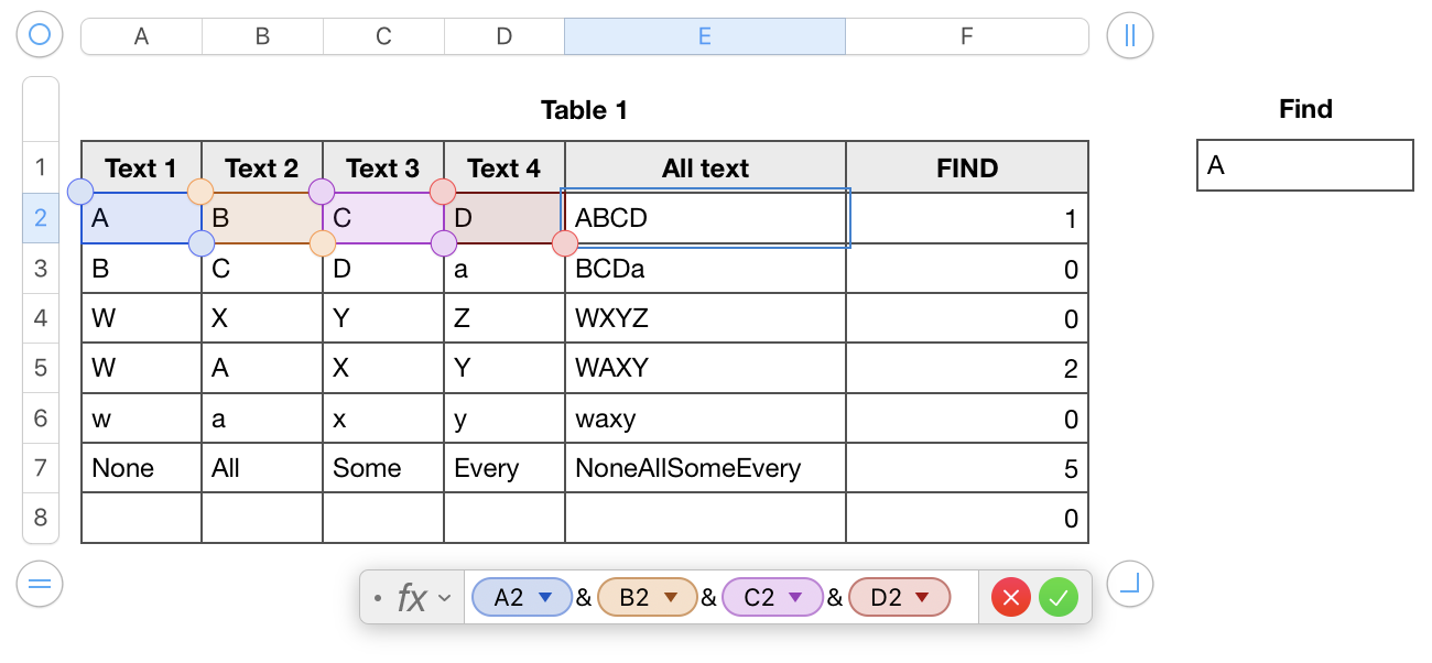 Formula in F2 =IFERROR(FIND(Find::$A$1,E2),0)