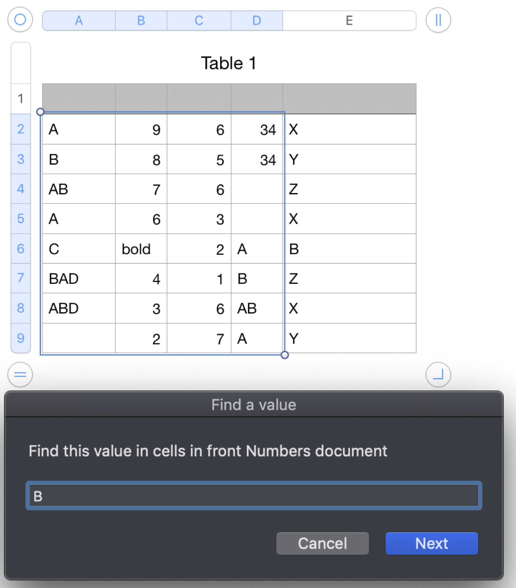 Thereafter, to use, select the area of your table that you want to search (for example the first four columns) and choose Find in Selection from the Numbers > Services menu. The script will prompt you for a search term and then list the cells where that search term occurs. You can work from the list, or click one of the search 'hits' to go immediately to that cell.