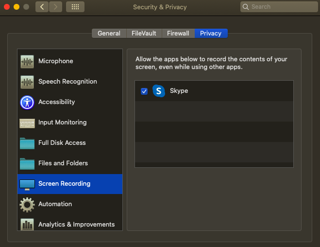 I already provided all needed permission from System Preferences >> Security & Privacy >> Privacy >> Screen Recording but then also i can not share my screen on Skype.