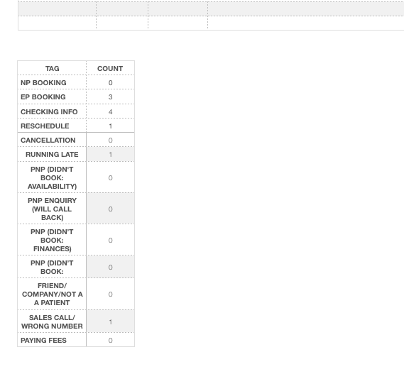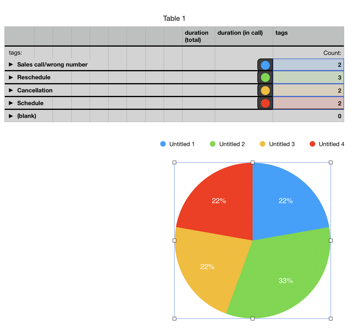 Please bear in mind that I have seen the help articles which state that the data has to be presented like "Reschedules = 30... Cancellation = 12..." etc, but my data does not download in that fashion (as you can see above), and it defeats the point if I am supposed to somehow create a separate table of data from which to make the pie chart from. How would I go through 300+ entries of phone logs, add the occurences of the tags up, just to create a separate table to make a pie chart from? It would take me hours!! I simply need to be able to select the column and it will add up the occurences of each tag for me. How can I do this? It's got to be possible if it's so easy on Google Sheets! I much prefer using numbers but this has been bugging me for over a year now! I will be sooooooooo happy and grateful if someone could tell me what I'm doing wrong! Thank you :)