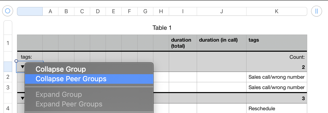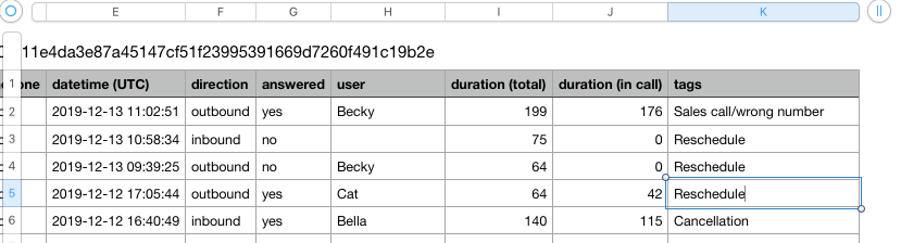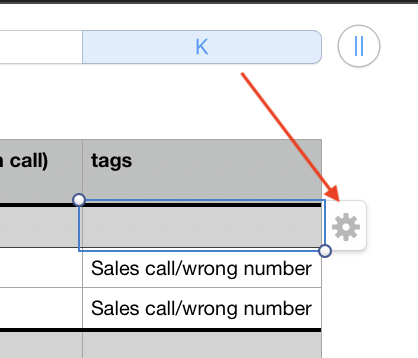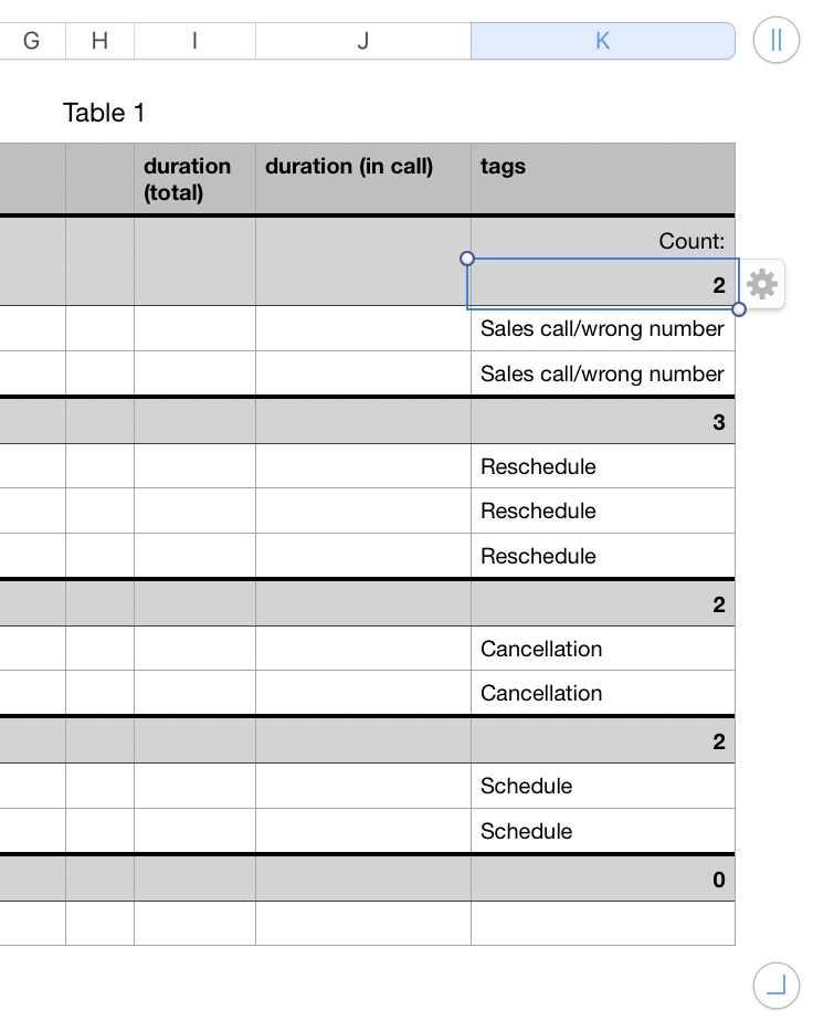 What I want to do (which I can do very easily using Google sheets) is select column K, and create a pie chart to show what percentage of the calls were Reschedules, what percentage were cancellations, what percentage were sales calls etc.