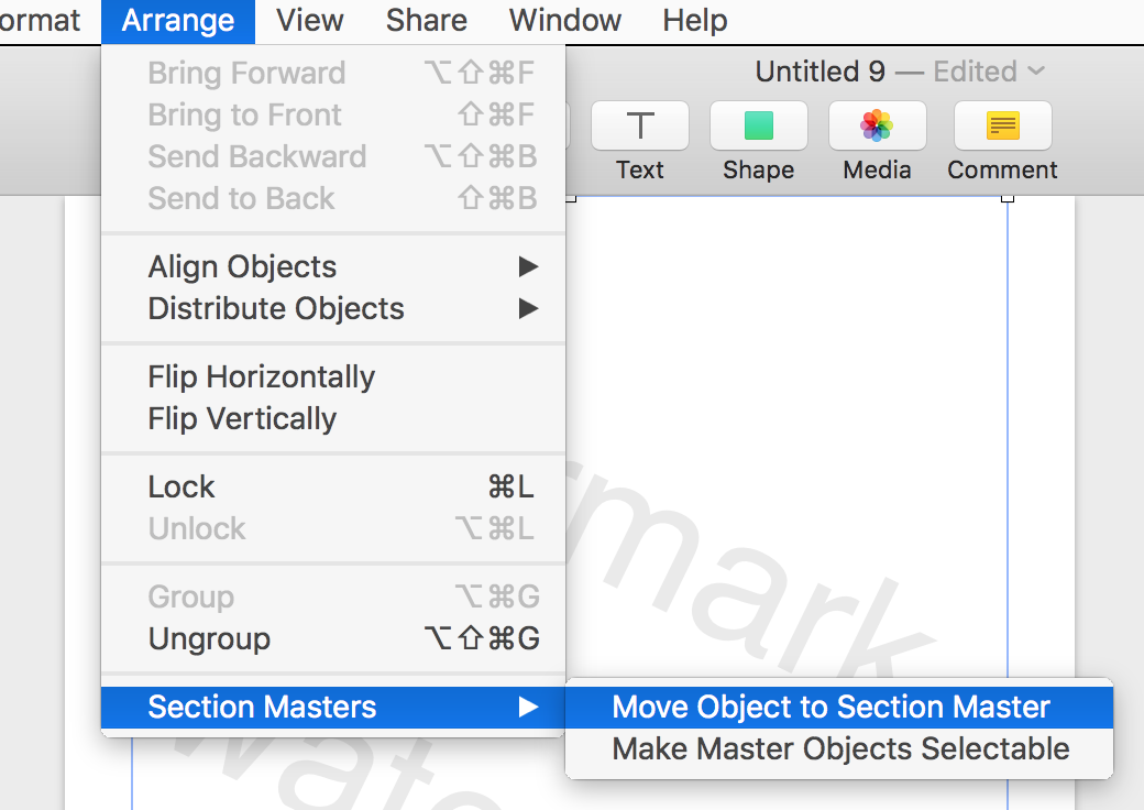 If it is missing from the next section, you can place the insertion point on a page that has the watermark, then go Arrange > Section Masters > Make Master Objects selectable.