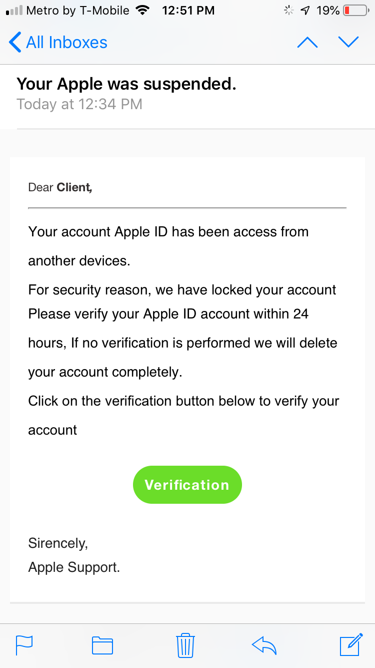 I received an email stating my Apple ID was accessed from other devices and that my account is locked and will be deleted if I don’t verify my Apple ID in 24 hours.