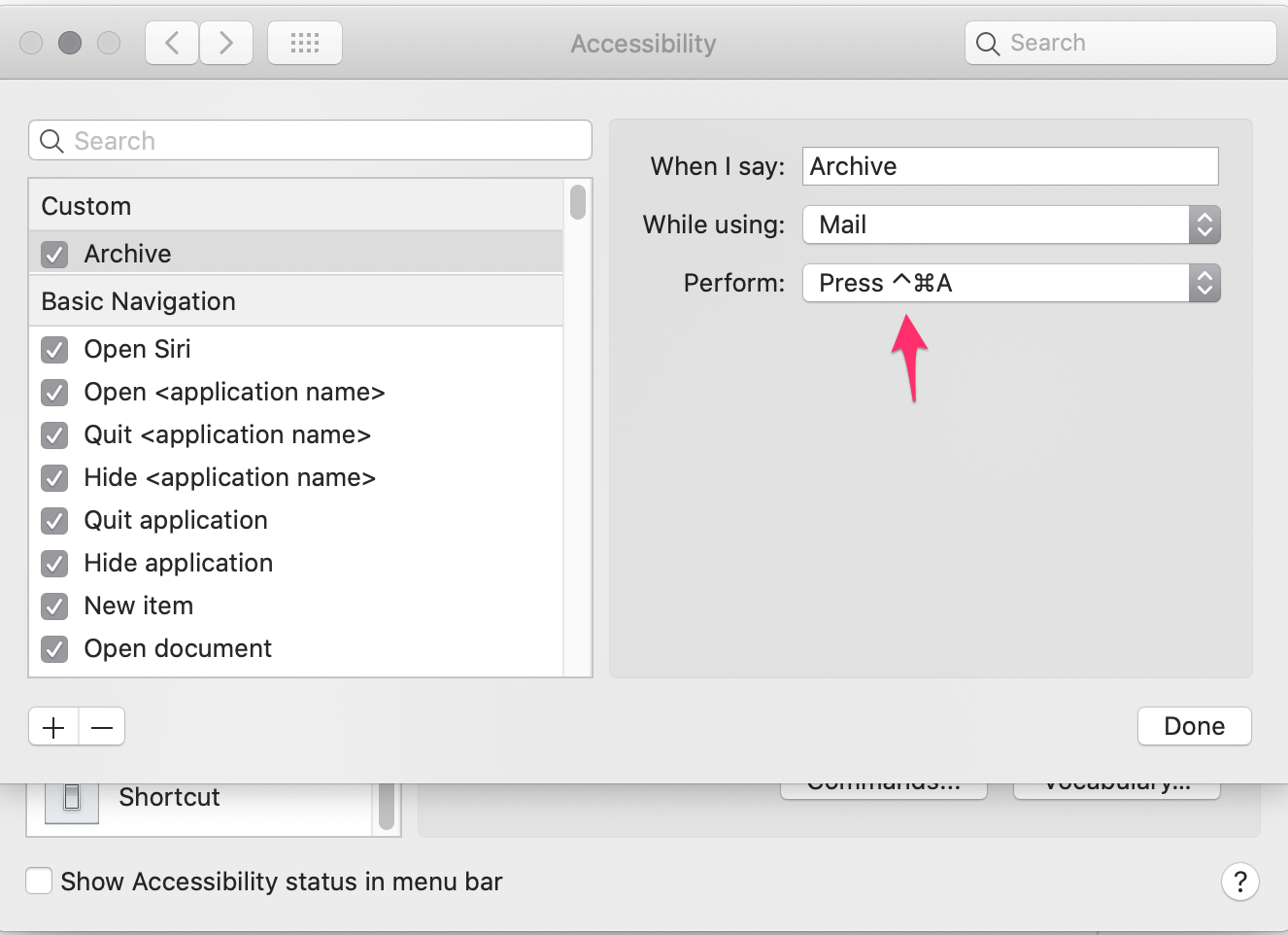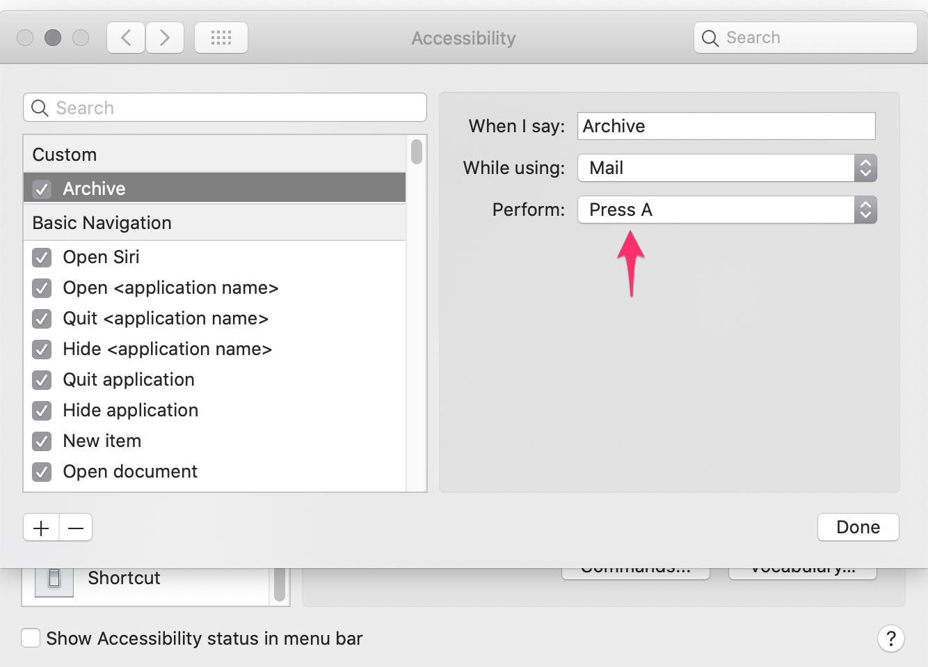 Let me start over. I am using voice control because of a mobility impairment. I'm trying to create commands under Accessibility > Voice Control, where I click "Commands...", hit the + to make a custom command,I give it the name "Archive" and assign the voice command (Press Control, Command, A) and then click "Done" to save it.