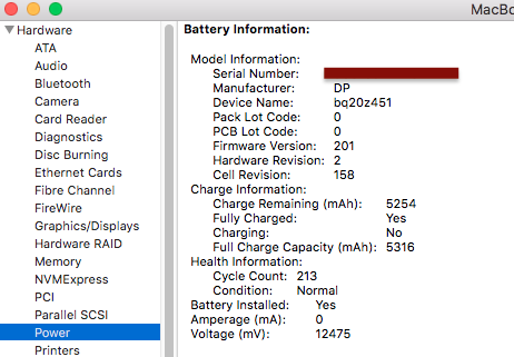 Also, use System Information to check your battery cycles and condition. You can find the System Information app in the folder path Applications > Utilities. Run it and, when the main pane displays, select "Power" from the left-hand contents pane to display your battery's data: