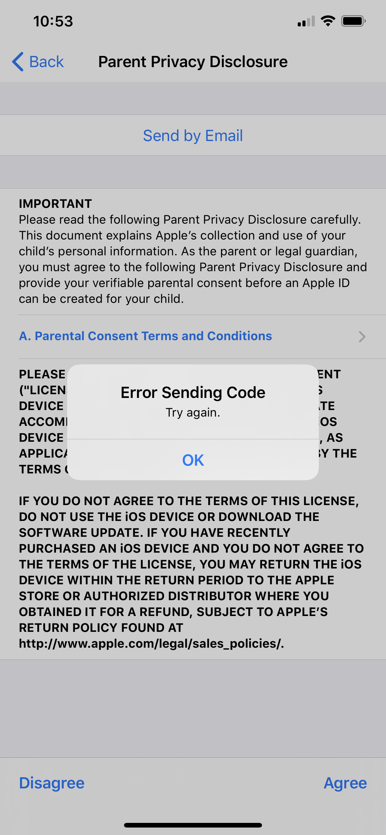 I am trying to create an Apple id for my child and I keep getting the message “Error sending code, try again”, when I try to agree to the terms. What do I need to do?