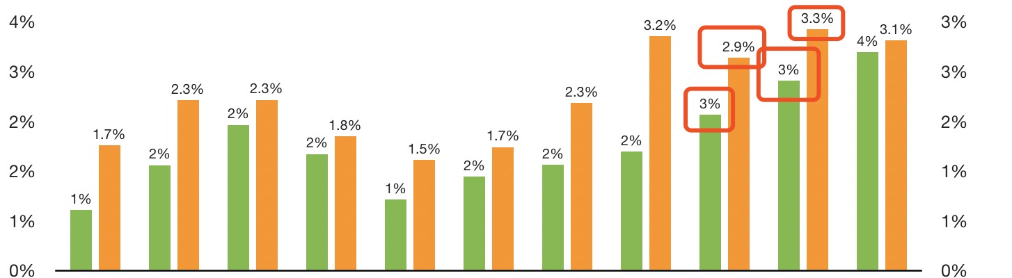 The range on the left is zero to 4%, while that on the right is 0 to 3%