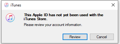 I am getting this message: This Apple ID has not yet been used in the iTunes store. Tap Review to sign in, then review your account information. When I tap on Review it just doen't do any thing?