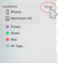 From the Finder Window side bar—and move your mouse to the right of Locations to reveal the Show/Hide menu item: