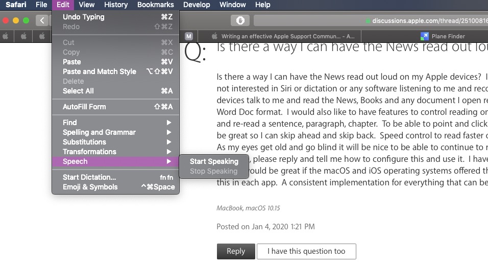 Is there a way I can have the News read out loud on my Apple devices? If so, please tell me how to turn that on. I am not interested in Siri or dictation or any software listening to me and recording me. I am interested in having my Apple devices talk to me and read the News, Books and any document I open regardless as to whether it is in PDF or Pages or Word Doc format. I would also like to have features to control reading on my Apple devices, like go forward or go back and re-read a sentence, paragraph, chapter. To be able to point and click and have a document read from there would be great so I can skip ahead and skip back. Speed control to read faster or slower would be a good control to have too. As my eyes get old and go blind it will be nice to be able to continue to read and learn as long as possible. If all of this is available, please reply and tell me how to configure this and use it. I have been looking and cannot find out how to do this. It would be great if the macOS and iOS operating systems offered this so that I won't have to figure out how to do this in each app. A consistent implementation for everything that can be read would be fantastic.