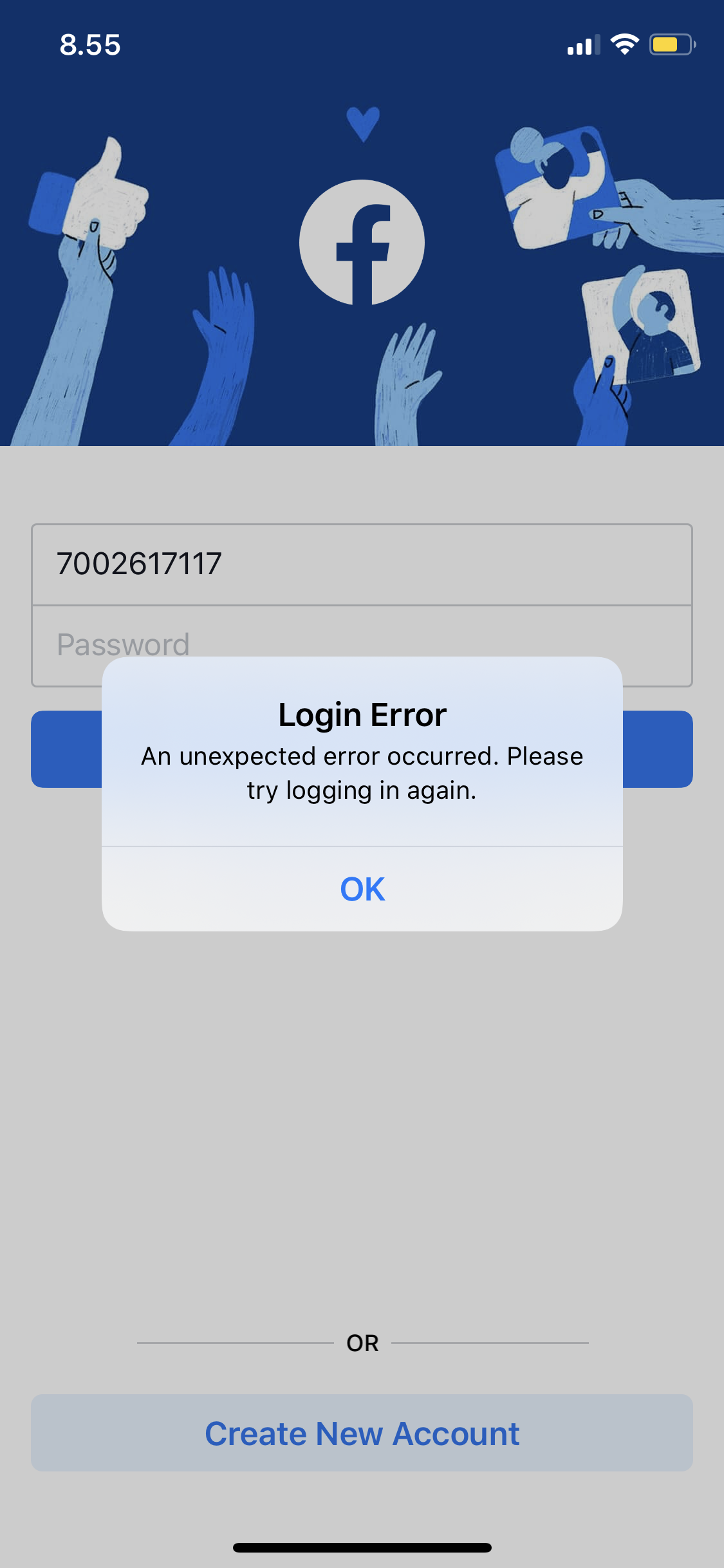later I install Facebook app and can no longer log in. It says - Sorry, an unexpected error occurred. Please try again later. (I have an iPhone Xs)