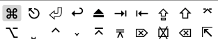Use control+command+spacebar to launch the character viewer. In the categories, does it show Technical Symbols? If not, click the gear icon on it, select Customize List…, and select Technical Symbols from the available categories. You will find many familiar symbols there that Apple uses to illustrate key stroke modifier keys. Here are the first two rows:
