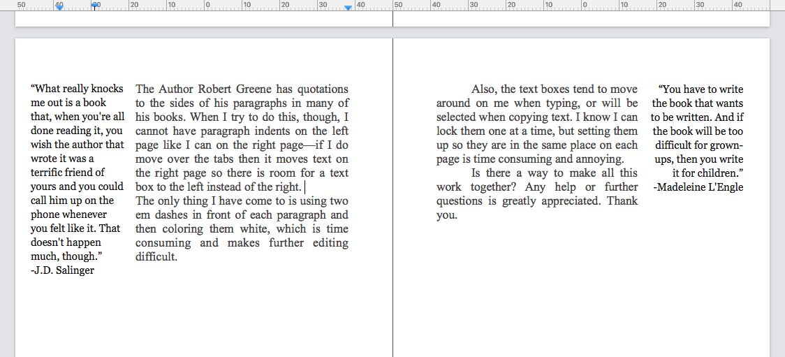 The Author Robert Greene has quotations to the sides of his paragraphs in many of his books (see picture). When I try to do this, though, I cannot have paragraph indents on the left page like I can on the right page—if I do move over the tabs then it moves text on the right page so there is room for a text box to the left instead of the right.