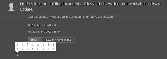 Pressing and holding for accents, tildes, and others does not work after software update.