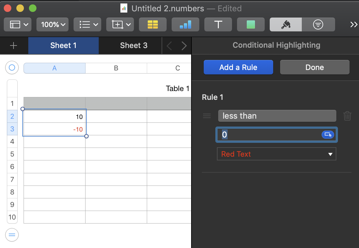 Select the cells and add a Conditional Highlighting rule like this in the Cell pane of the inspector at the right: