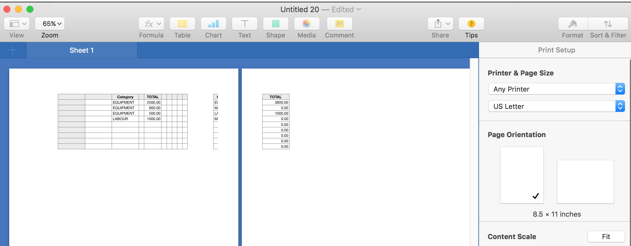 How do I change the page orientation within Numbers Version 6 without it being done from the print menu? I can set up the page layout to be Landscape in Microsoft Excel, but not in Numbers