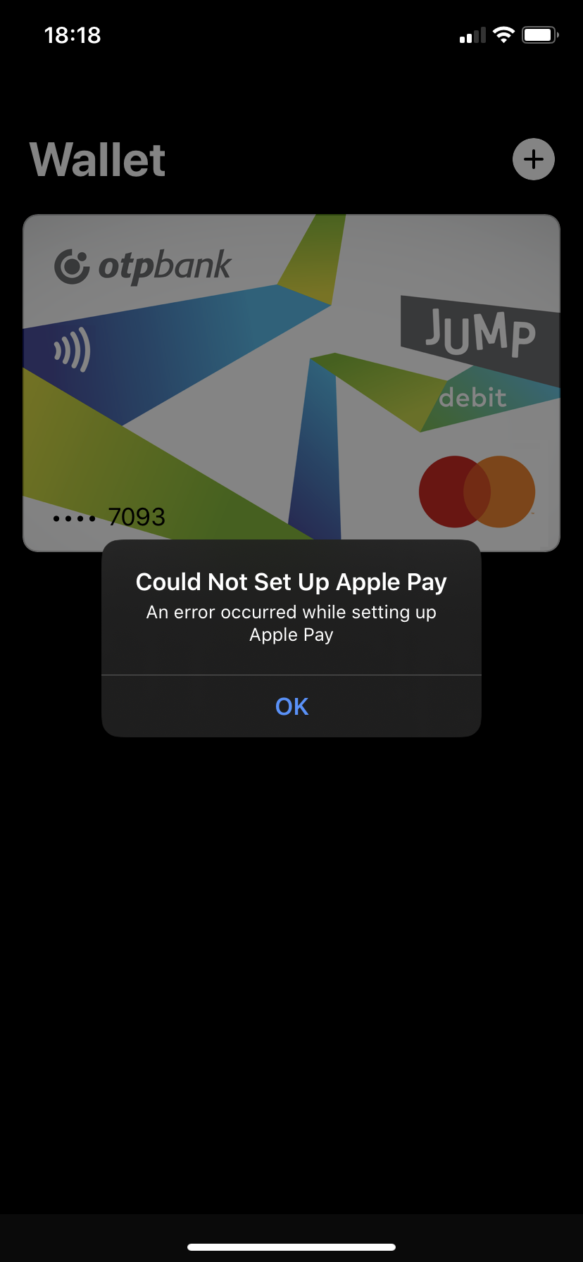 Iphone 11: It gives error “Couldn’t set up apple pay” when I click “+” button to add second card in Wallet. Region is okay, iOS is up to date. I restarted the phone and tried again. But still the same error.