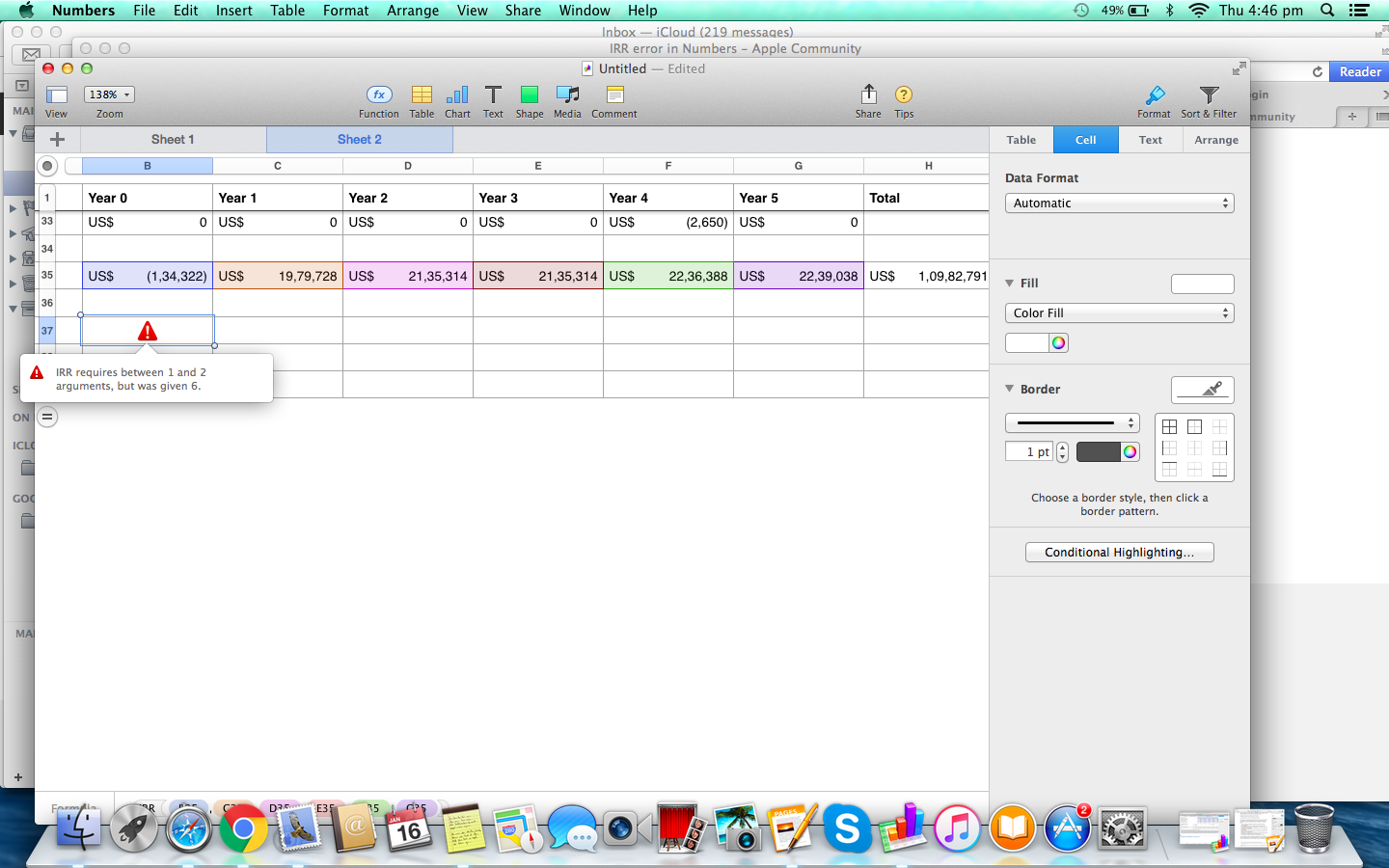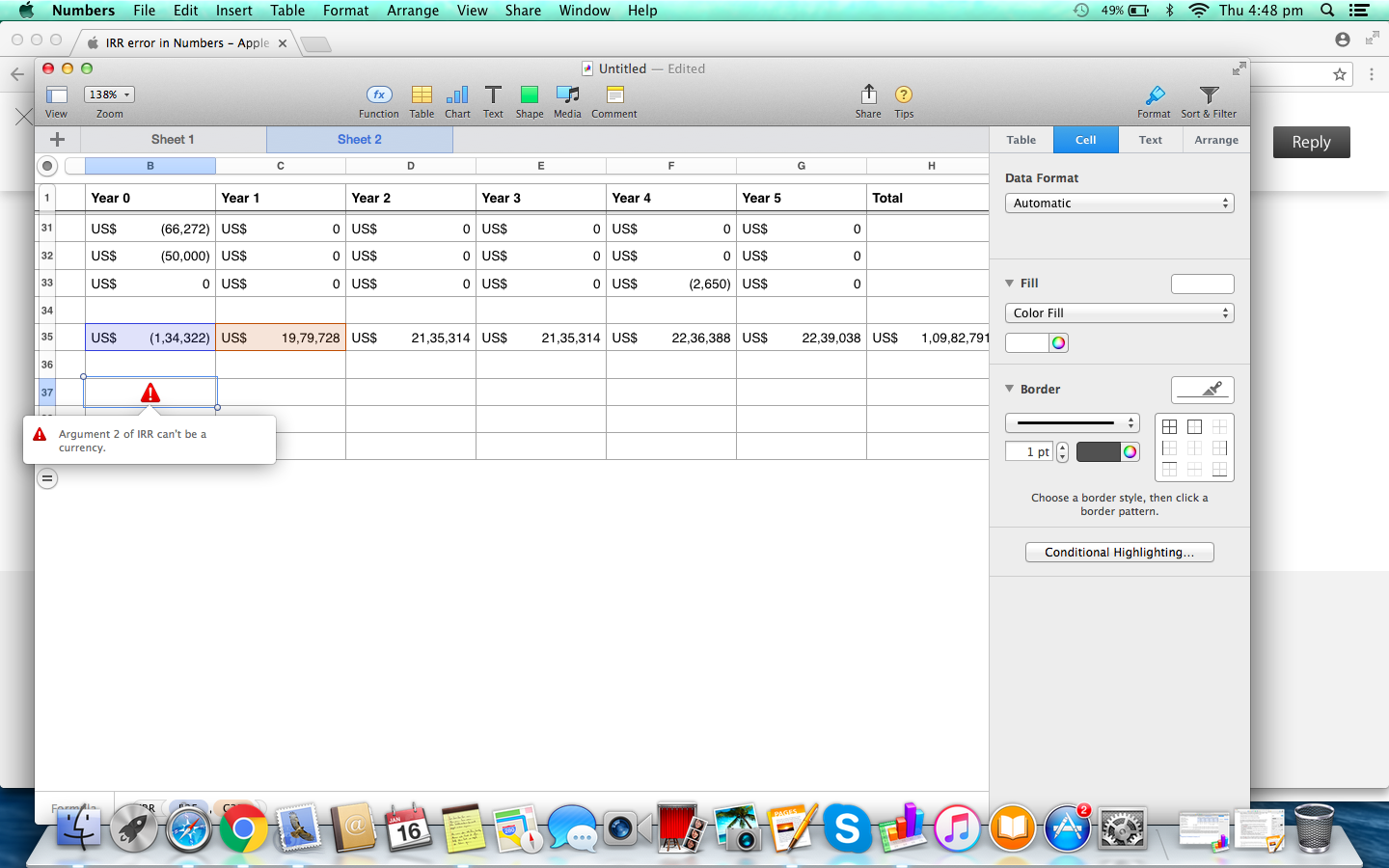 I'm getting an error while calculating IRR in Numbers saying, "IRR can't be currency." I have tried remove currency for the respective cells, putting them on automatic; however, the issue persists. I have also tried different possibilities e.g., entering amount without comma, with comma, with and without $.