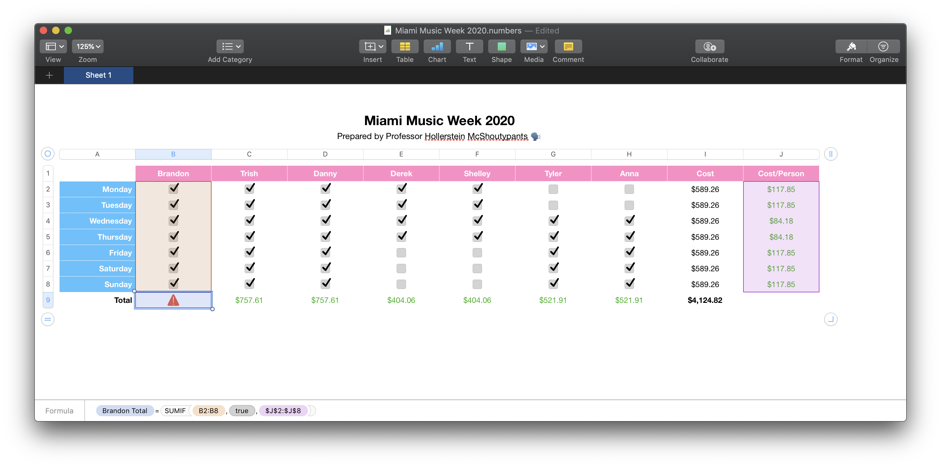 In this example, each cell in column J should be $589.26 ÷ the number of checked boxes in that row's columns B-H.