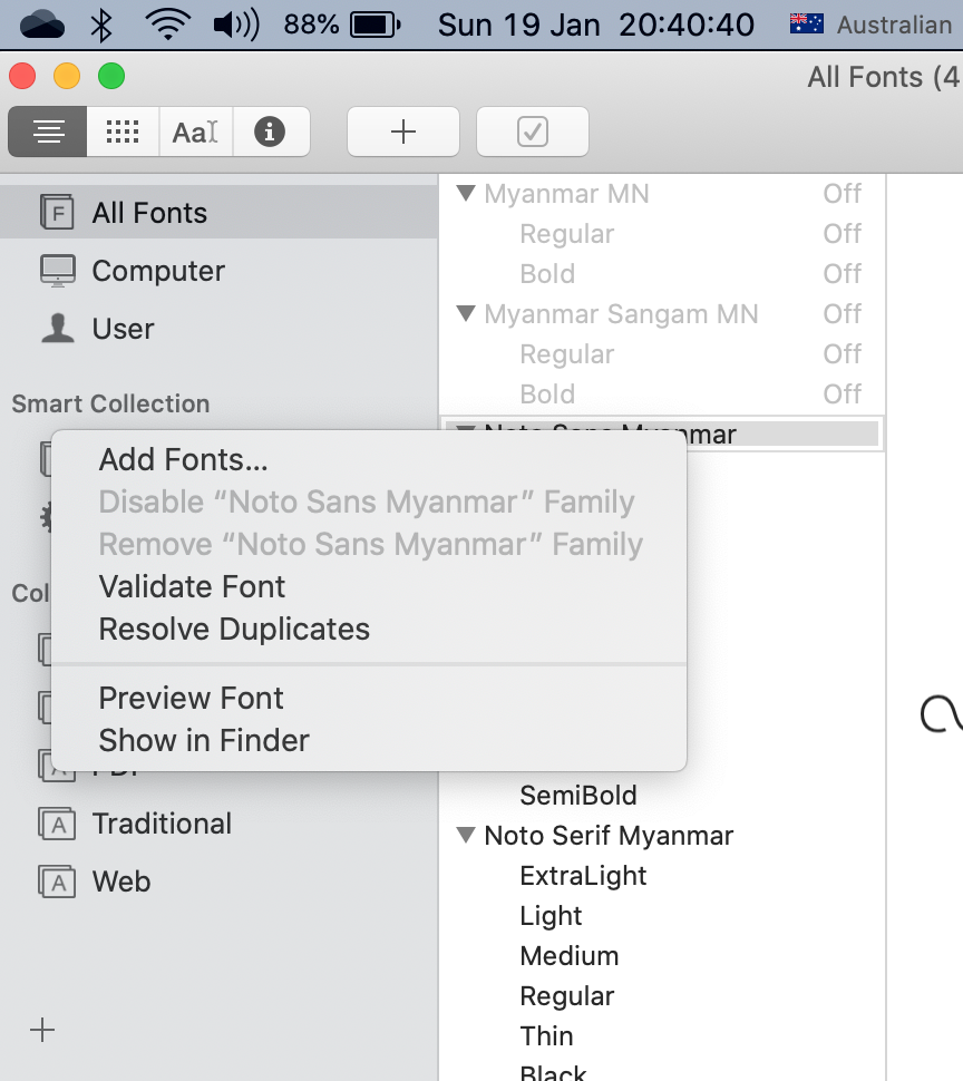 As you may or may not aware, Myanmar font is under UniCode and previously, majority of Myanmar people are using the font system called "Zawgyi". Since this is the transition time, we need to disable all other fonts while using single type of font. Sounds crazy.