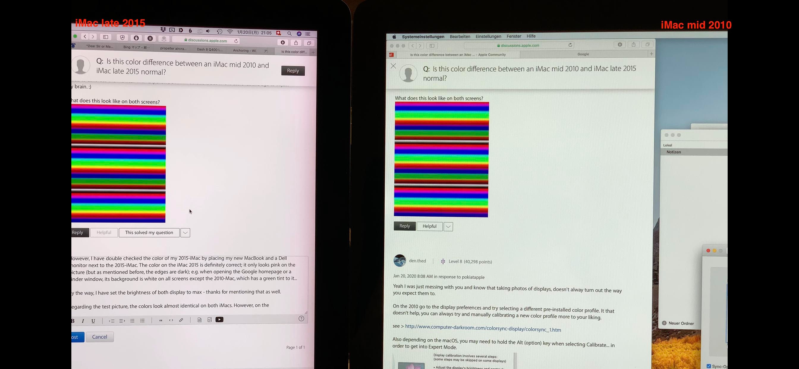 However, when put aside my iMac late 2015 (left side), I notice that the colours on the 2010-iMac are displayed in a greenish/yellow tone in comparison to the 2015-iMac: