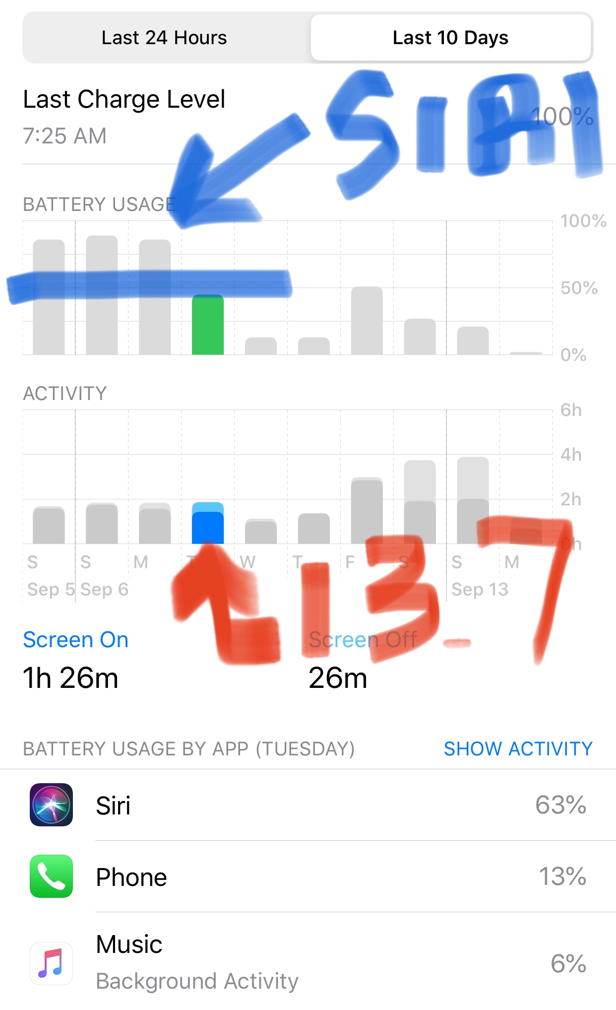 I solved the Siri problem by doing a hard restore from iTunes and shutting Siri off completely (second time doing a hard restore). However, now Mail Background Activity is eating my battery. This is ridiculous. I have had to change all settings to manual fetch for email and the battery still drains far faster than it should but at least lasts more than four hours. Really hope Apple is working on this. By the number of people complaining about the same problems, it definitely isn't going to be solved by replacing the battery in my new iPhone, which is what Apple Tech Support told me to do despite the fact diagnostics showed the battery is just fine. My new iPad also still drains at a ridiculous rate. I have to power it right off between uses rather than just closing the cover. I am one frustrated Apple customer.