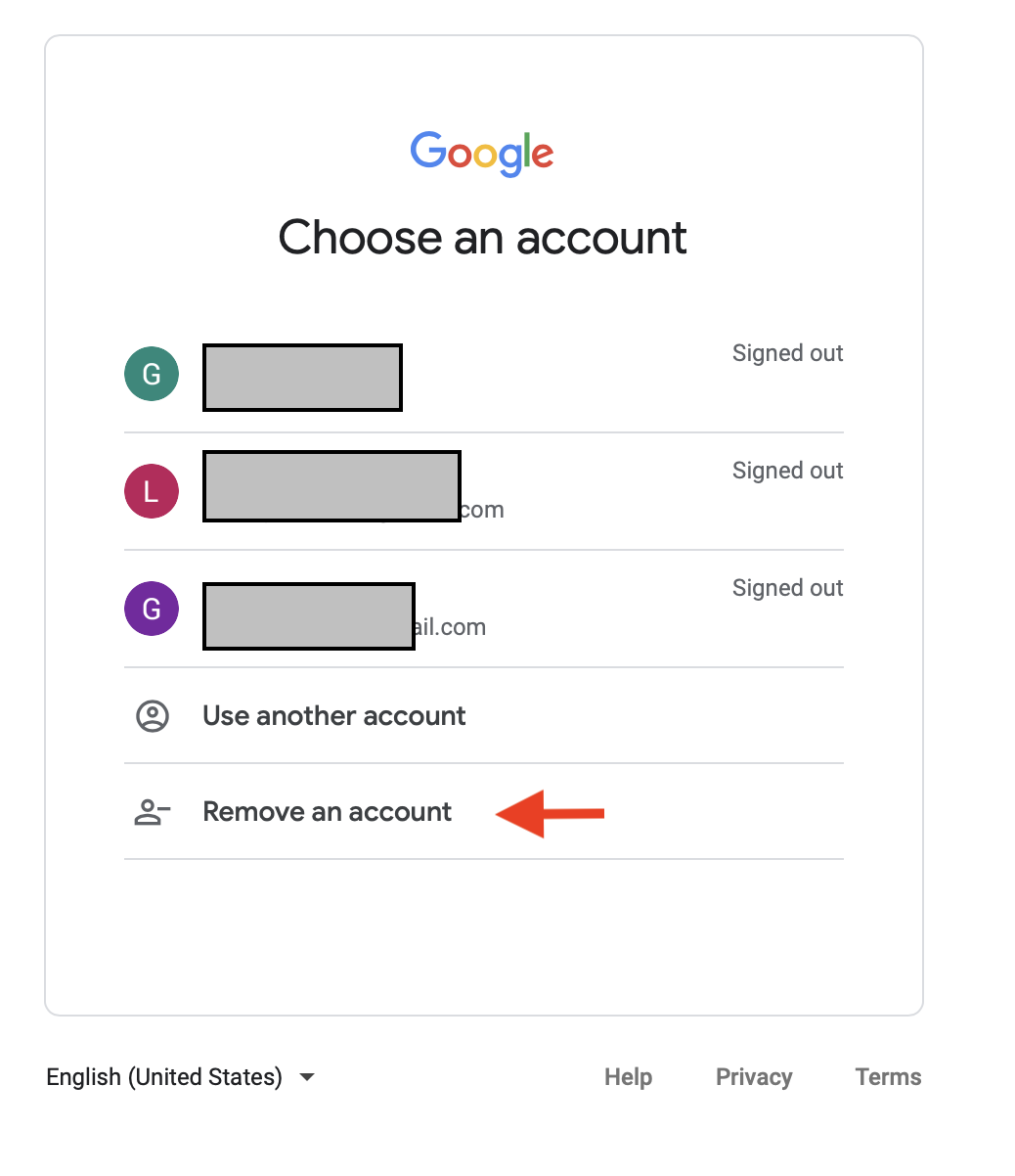 Log off your Google account in the browser window. Click on "Login" if not already selected in the browser window. Click on "Remove an Account" (as shown in the screen shot below). All accounts listed in the log-in window will then have a red circle icon with a slash through it. Select the one you want to delete from the browser memory, click on the red icon. And you're done.