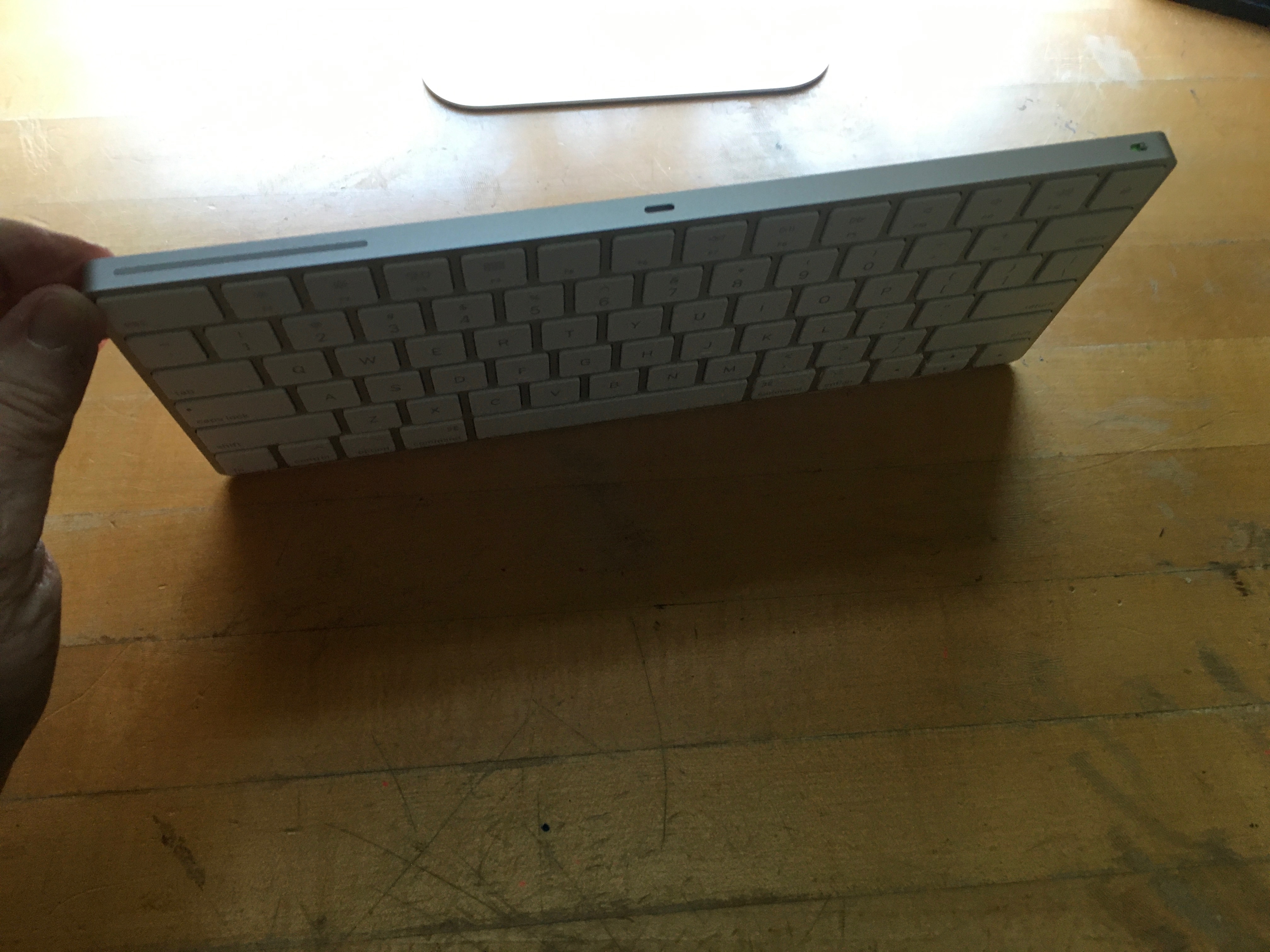 Your Mac came with a USB to lightning cable. Plug it into a USB port on your Mac or a power brick, then into the lightning port on your keyboard.