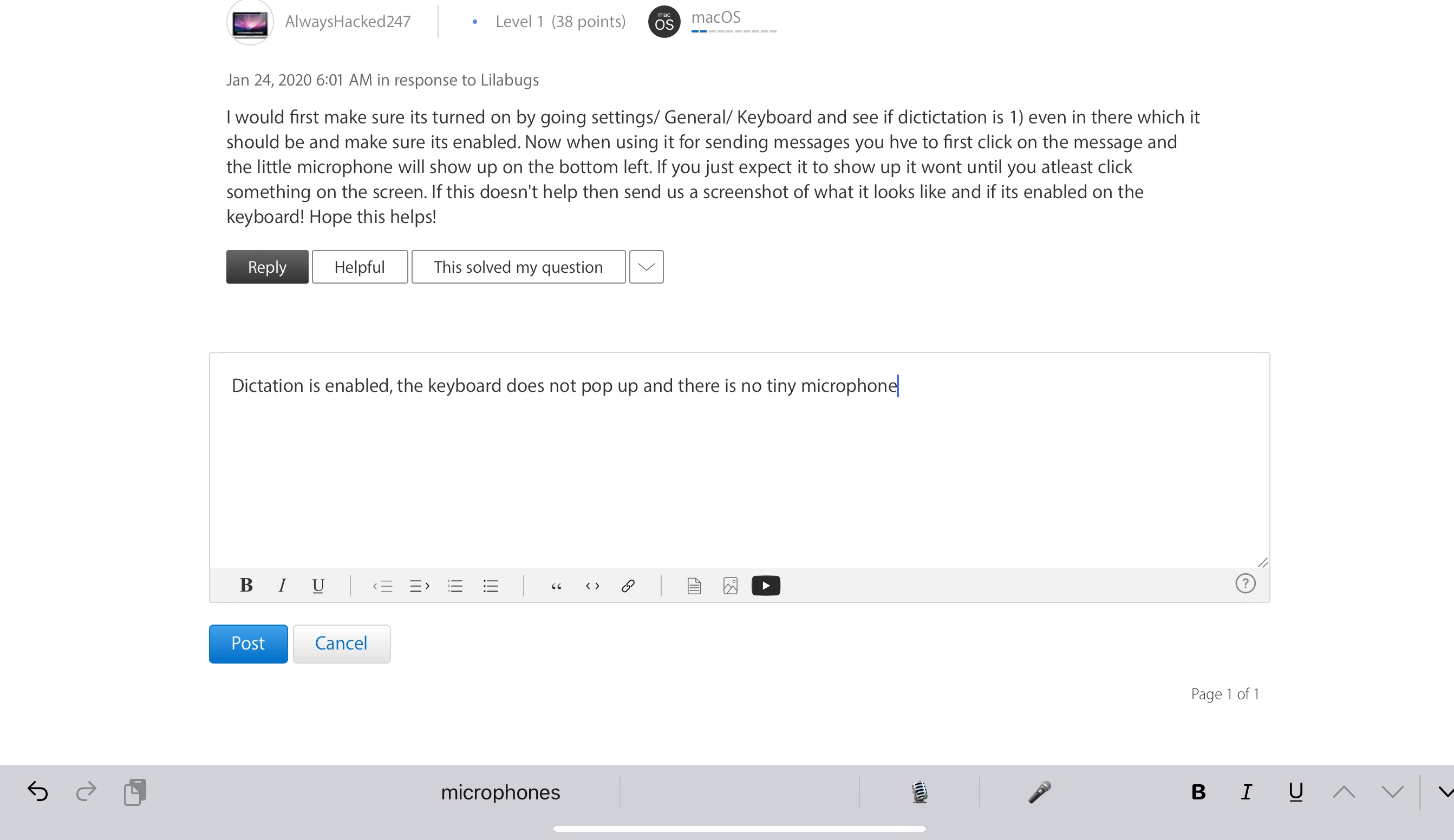 Dictation is enabled, the keyboard does not pop up and there is no tiny microphone. What you see at the bottom of the screenshot is what i see when I type a new document.