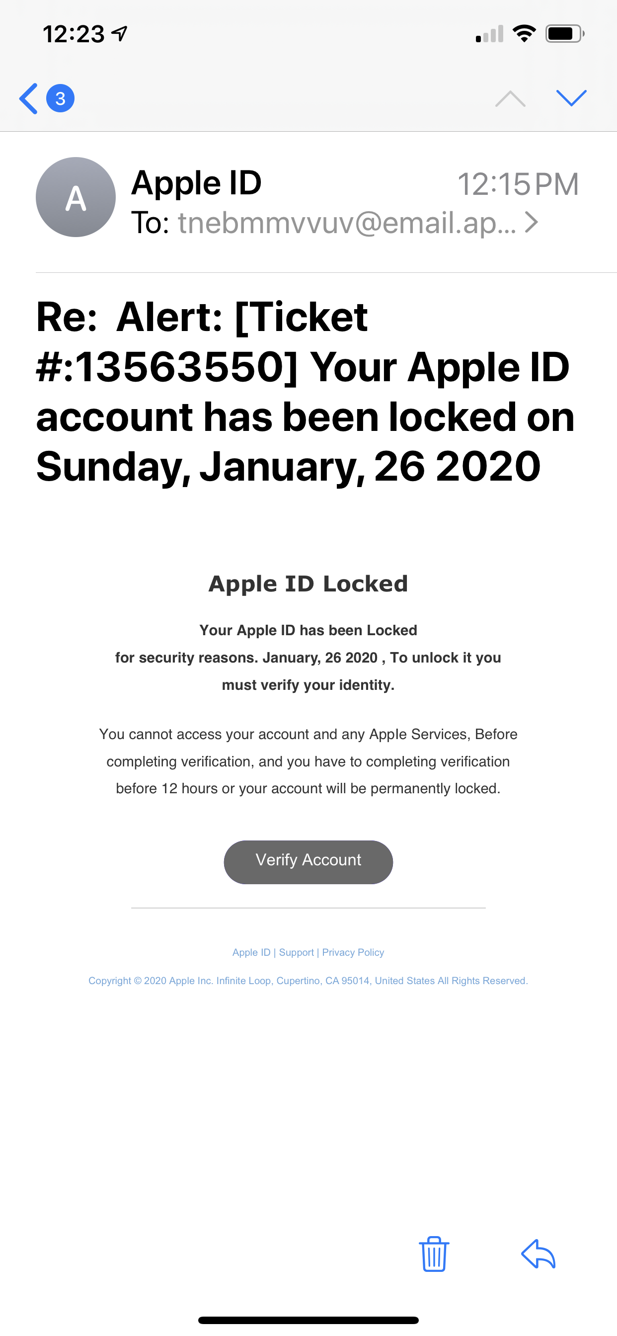 I received this email from apple today and I was curious whether this was a scam or if it is real? Judging by the email address it was sent from and sent to seemed fake as well. When I clicked on the link to verify it brought me to an apple website that seemed real but when I clicked on the menu pull down it wouldn’t come down which leads me to believe it’s fake. Please let me know if this is something I should be worried about.