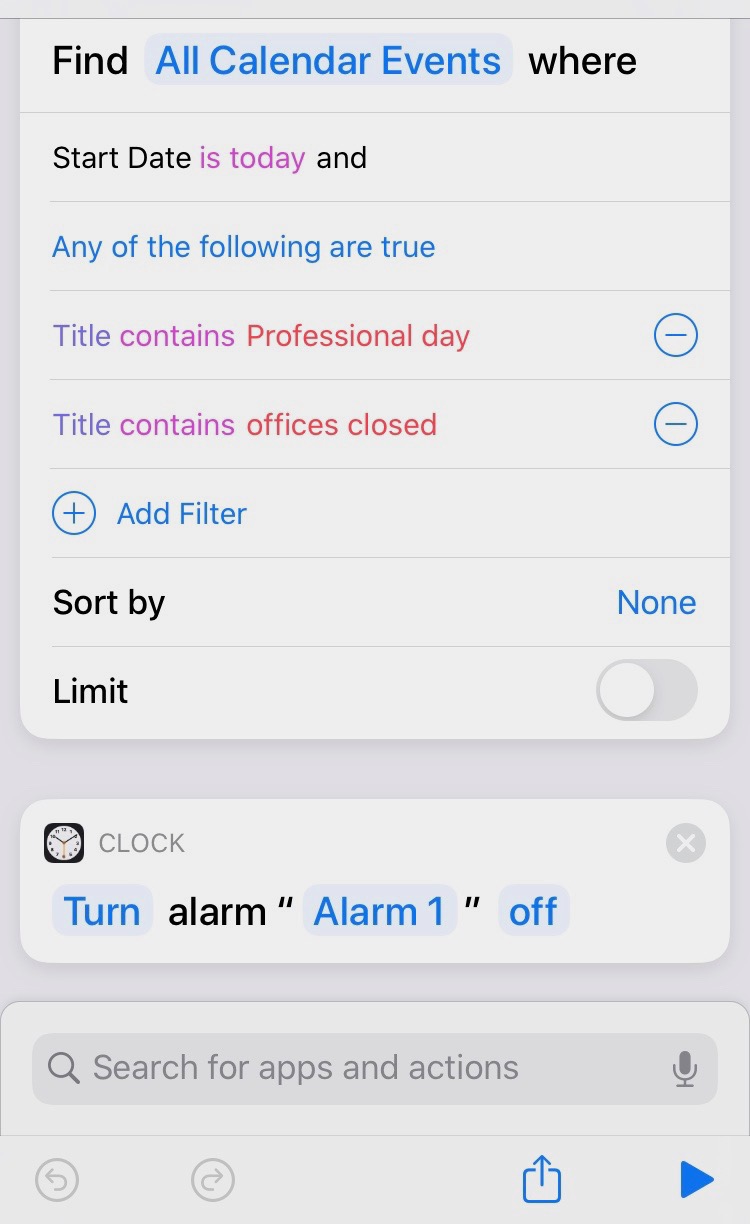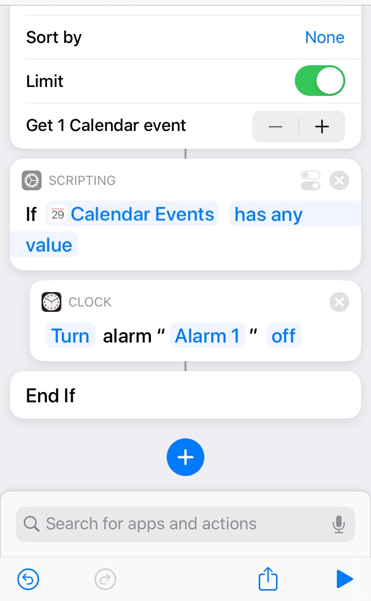 I am trying to create a shortcut via the shortcut app on an iPhone 8 version 13.3. I want the shortcut to use calendar app inputs (certain event titles, start date, specific calendars) in determining whether to toggle an alarm. However, the problem I am having is that the shortcut is not detecting the false conditions and running the shortcut as if the false conditions are true. So for instance: