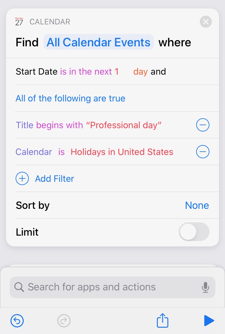 I have tried different condition variations like this one, adding the specific calendar and still not working, wondering if there is any guidance on what I have wrong with the shortcut logic or values: