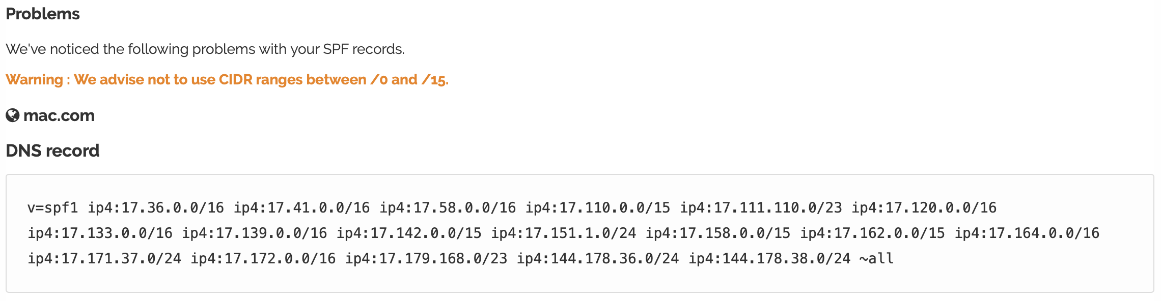 Mac.com does not have an IPv6 block listed in it's SPF record. Unless iCloud.com is restricting SMTP to IPv4 only, recipients like Gmail is going to accept IPv6 connections, then fail the SPF authentication. Also Apple is designating small blocks which is not recommended for SPF.