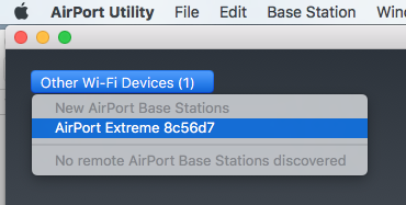 When you click on AirPort Extreme, that will start up the AirPort Utility setup "wizard". The wizard will take a few seconds to analyze the network and then display the correct setup with a screen that will look similar to the example below, except that you will see AirPort Extremes displayed and the name of your wireless network