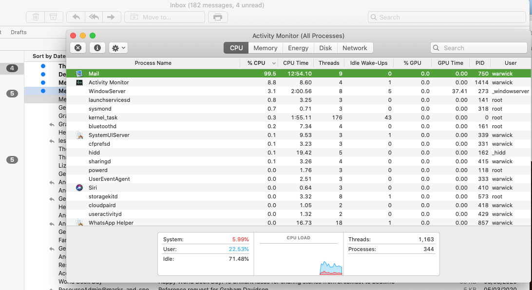 Mail is eating energy from my MacBook since the upgrade to Catalina. Mail is using 100%+ CPU resources by default and has spikes to 275% CPU. It's eating my battery and causing the Macbook Pro's fan to become active once and a while.