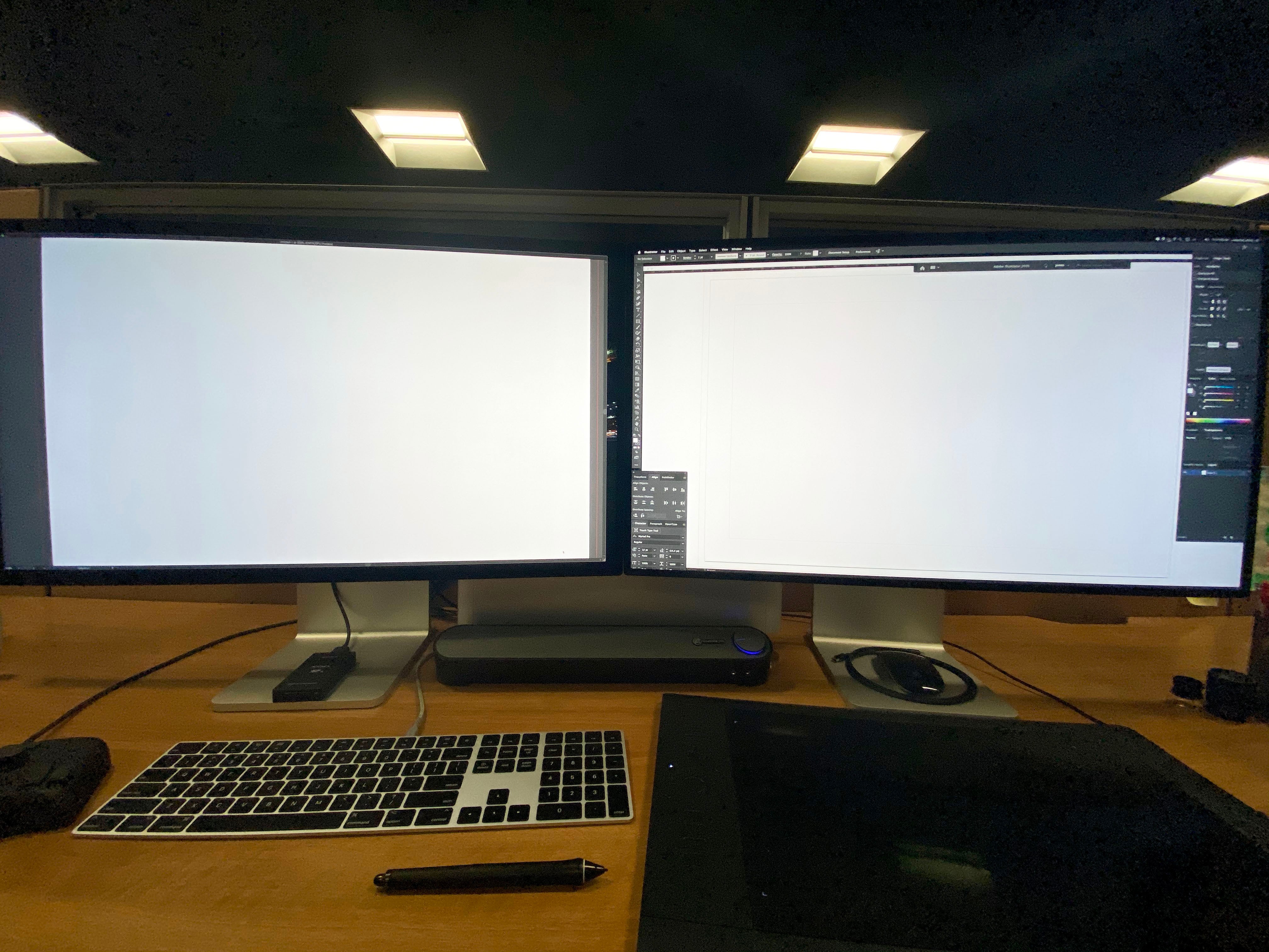 I work with primarily graphic design and photography apps where large white spaces are common, and I find myself rolling my chair side to side to see the portion I'm working on in what I assume is the more accurate color, but really... who knows.