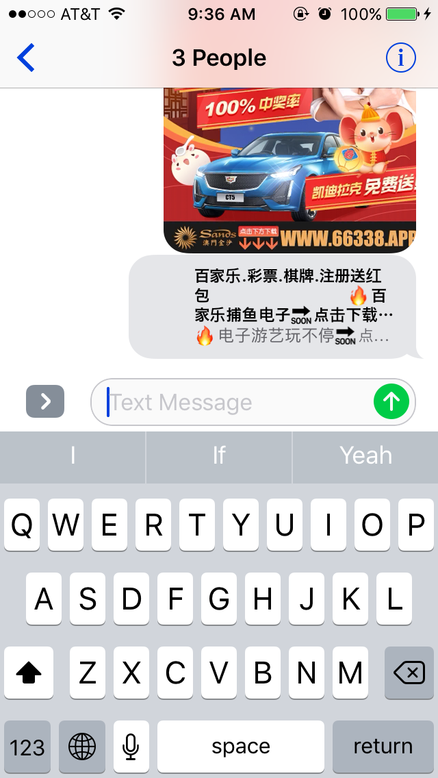 I then saw that I had a text history on my phone that seemed to show I was in a text group with an app (www66338app followed by some Chinese characters). There were 3 participants in the group. 1 was this app, the other 2 were my phone number. The texts appear to show as if I sent them (messages appearing on the right like in this pic)