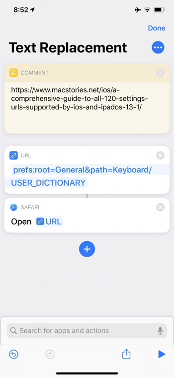 I was wondering how I would create a macro using the shortcuts app but I don't really understand how apple's system works. Basically what I wanted to do was have the shortcut open the settings app, then open general, then keyboard, then text replacement (I have to use it alot), but idk what commands do what or if it's even possible to automate that. All I managed to figure out was the very simple Open App part. Any elaboration on this would be appreciated.