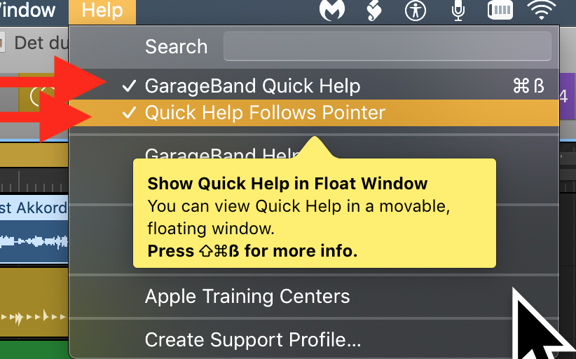Go to the "Help" menu in GarageBand and disable all checkmarks for "Quick Help".