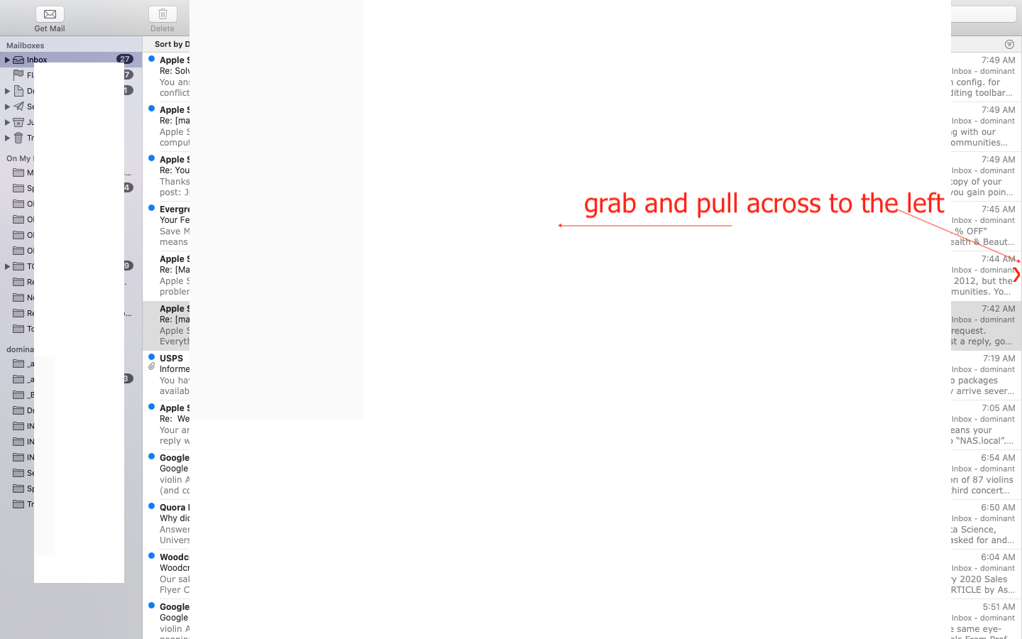 Position your cursor on the rightmost edge of the Mail viewer window. When positioning your cursor over it, the normal selection cursor will change and bear a resemblance to this