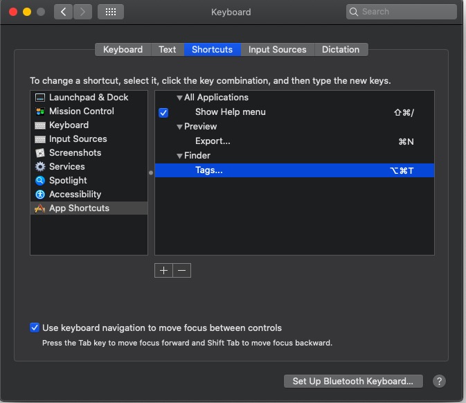 Thanks for reaching out to the Apple Support Communities! I understand that you have been unable to create a keyboard shortcut to access the Finder Tags.