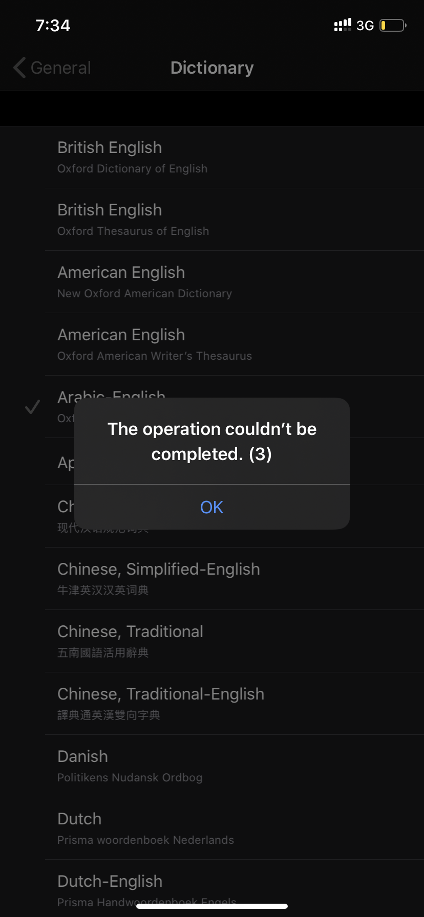 I try to download the dictionary from Settings >> General and it keeps saying the operation couldn't be completed (3). I restarted but the problem stills.