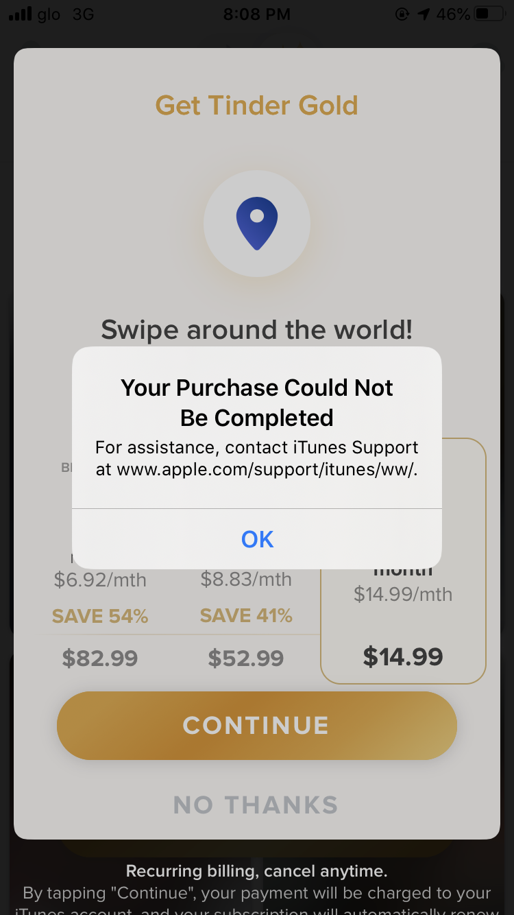 I have been trying to subscribe my tinder from my Apple account and is not working. I have $25 on my email but i don’t know what is the problem over 2 weeks now. I really need your help please
