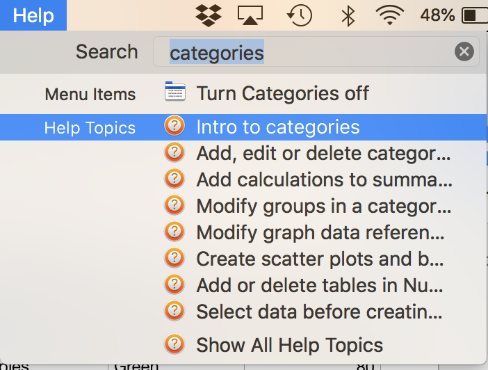 Menu > Help > categories