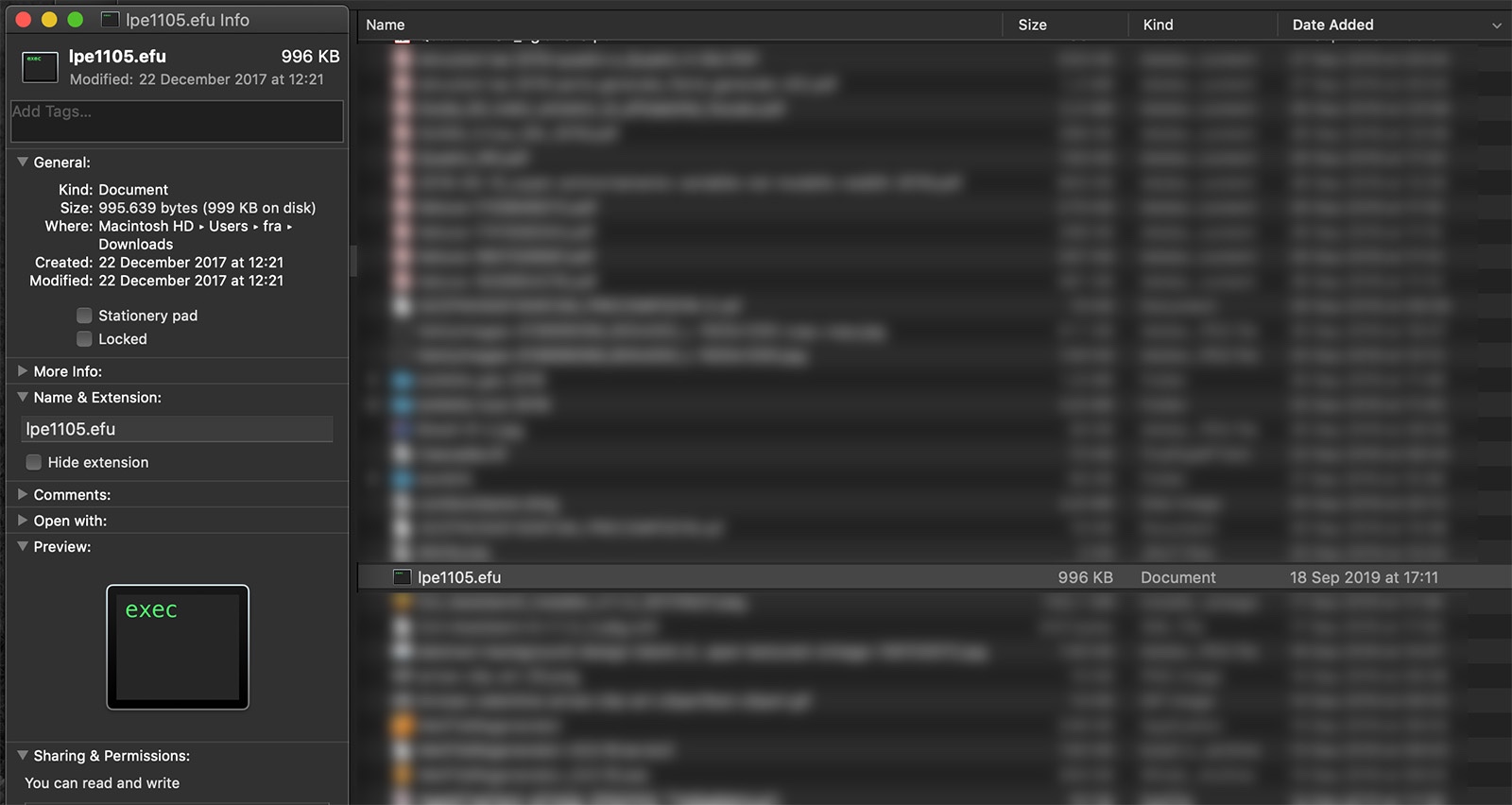 After a search in internet I discovered that lpe1105 is a fibre channel card made by HP for windows and Linux systems, and efu extension is "Public Key used to authenticate an encrypted Encryptafile (.EFL) file; contains a hexadecimal representation of the public key; made available to the public and used along with the Private Key (.EFR) file to verify a digitally signed file."